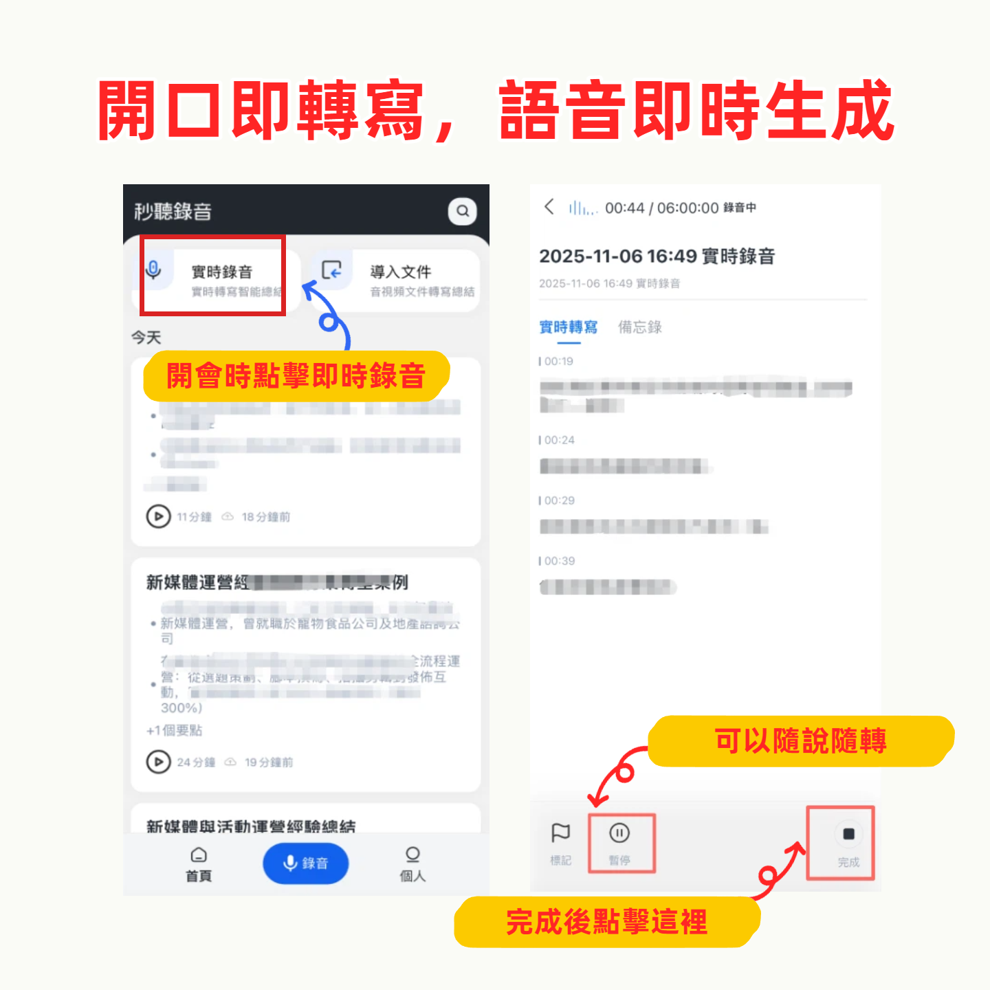 善用秒聽錄音的即時轉錄、AI摘要與待辦清單功能,提升全體會議的參與度、透明度與執行力,促進團隊高效協作。