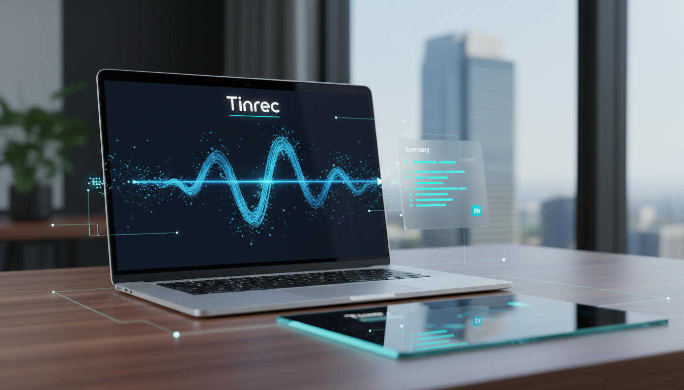 - 從錄音到行動的完整工作流: Tinrec 不僅僅是轉寫工具,它強調「理解」。在錄音當下即可進行即時轉文字,結束後 AI 會自動生成會議紀要、結論與待辦事項 (Action Items),直接將長達一小時的錄音濃縮成可執行的筆記。