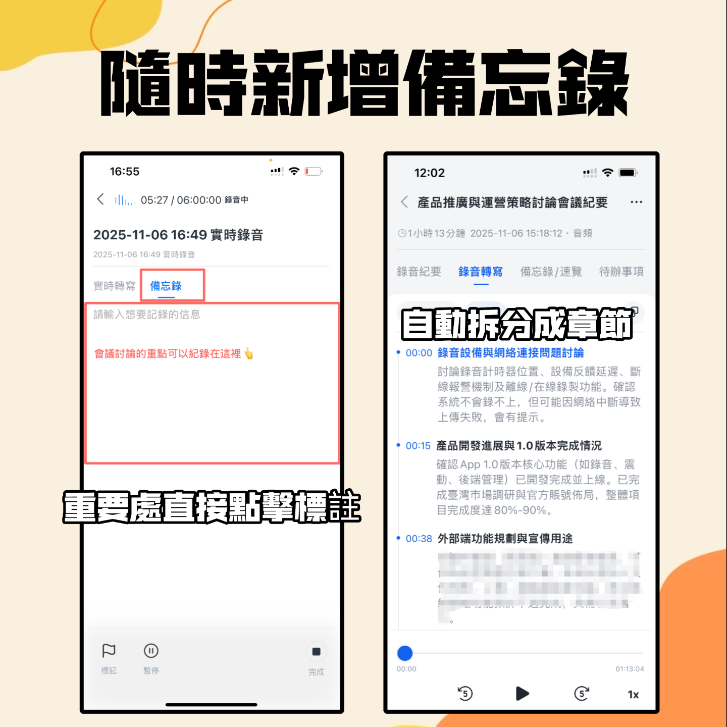 秒聽錄音,享每月300分鐘免費轉錄、每場會議30分鐘自動記錄,並支援音影片檔上傳,輕鬆提升會議價值。
