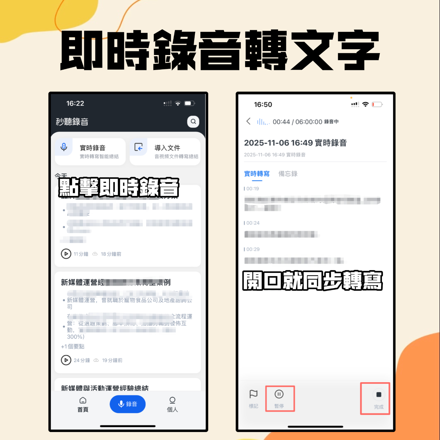 - 使用秒聽錄音助手:秒聽錄音提供即時語音轉文字功能,自動生成會議逐字稿,讓你無需分心筆記,專注於內容理解與互動。會後還可輕鬆分享紀錄給未能出席的同事,支援中文、英文、日文、粵語、閩南語等多語言辨識,大幅提升跨語境溝通效率。