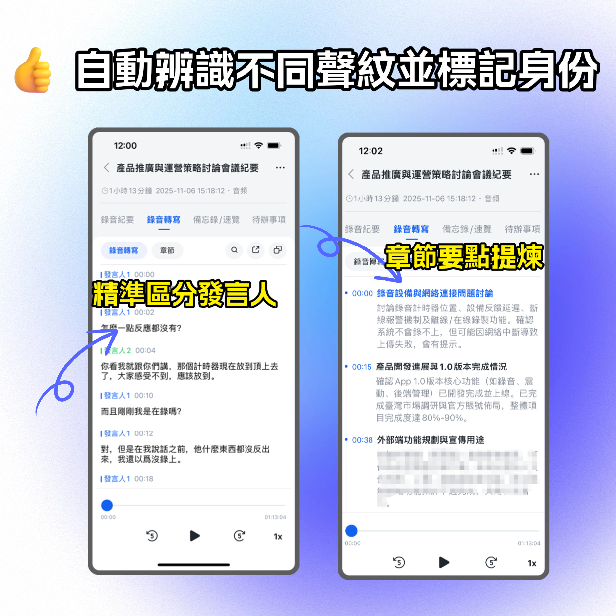 再者,閱讀速度比聆聽快約100字/分鐘,團隊成員能更快掌握重點。若錯過內容,也能直接回溯文字,無需反覆拖曳音檔。