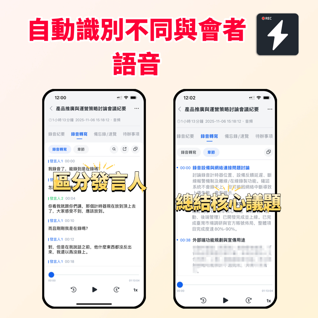 語音辨識自動標記講者姓名的功能更讓此流程更為順暢。隨著使用次數增加,秒聽錄音會自動學習並識別課堂中的發言者,幫助教師清楚掌握每位學生的參與狀況。