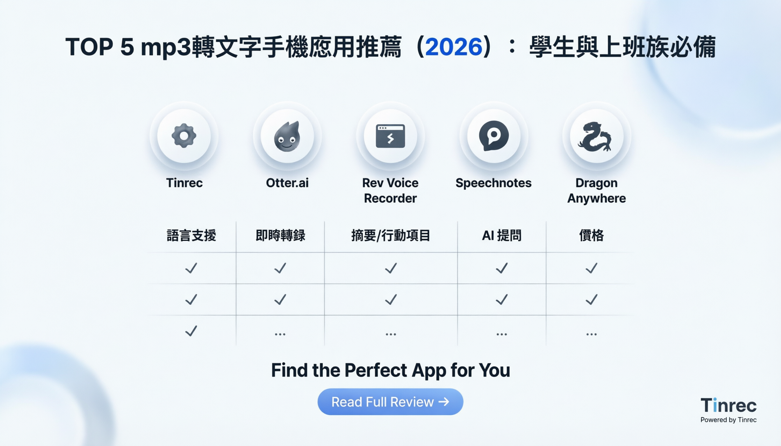 在日常學習和工作中,我們常常需要將錄音或mp3檔案轉換成文字,但市場上的工具眾多,如何選擇合適的工具成為了一個難題。本文將介紹五款熱門的mp3轉文字手機應用,並提供詳細的比較維度和使用教程,幫助您快速找到最適合您的工具。想要免費且功能強大的工具,請看Tinrec;重視多語言支援和AI查詢功能,請優先考慮Tinrec。