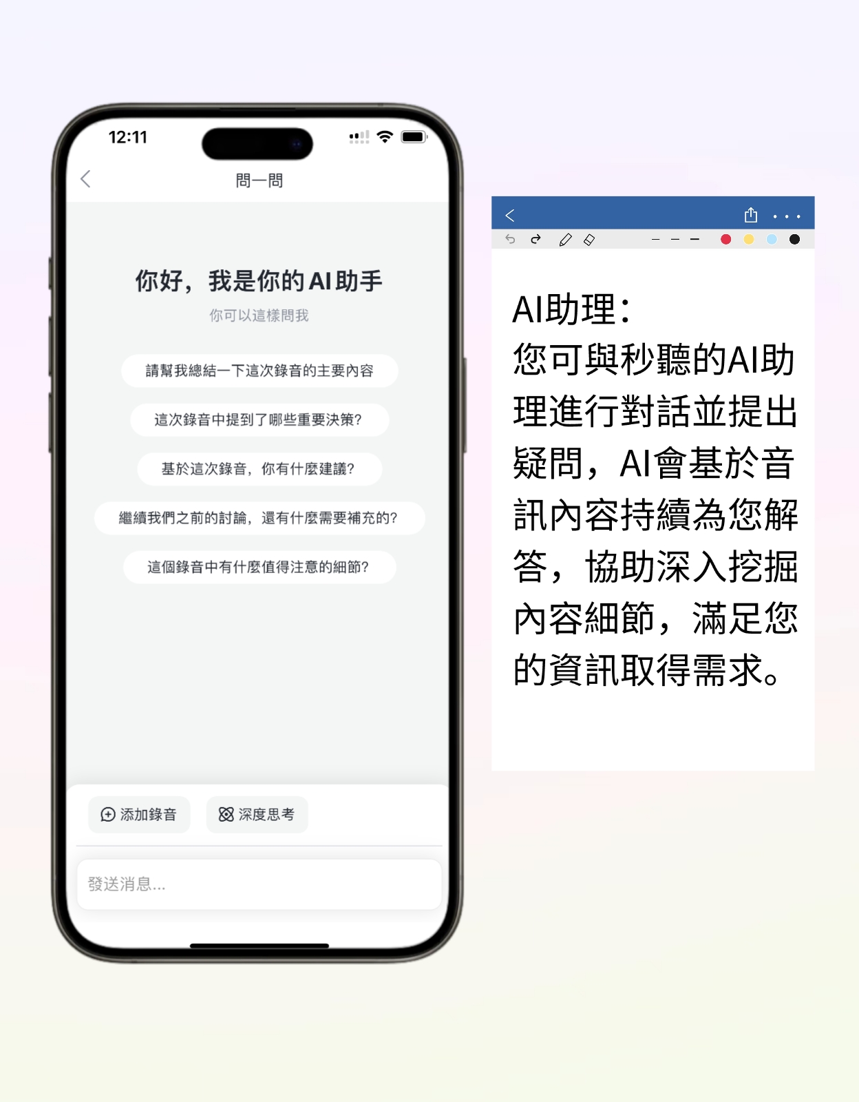 答:文字稿、AI 摘要、大綱、待辦事項、關鍵洞察等。透過秒聽錄音 Zapier 整合,一切皆有可能,讓您的數據運用更靈活。