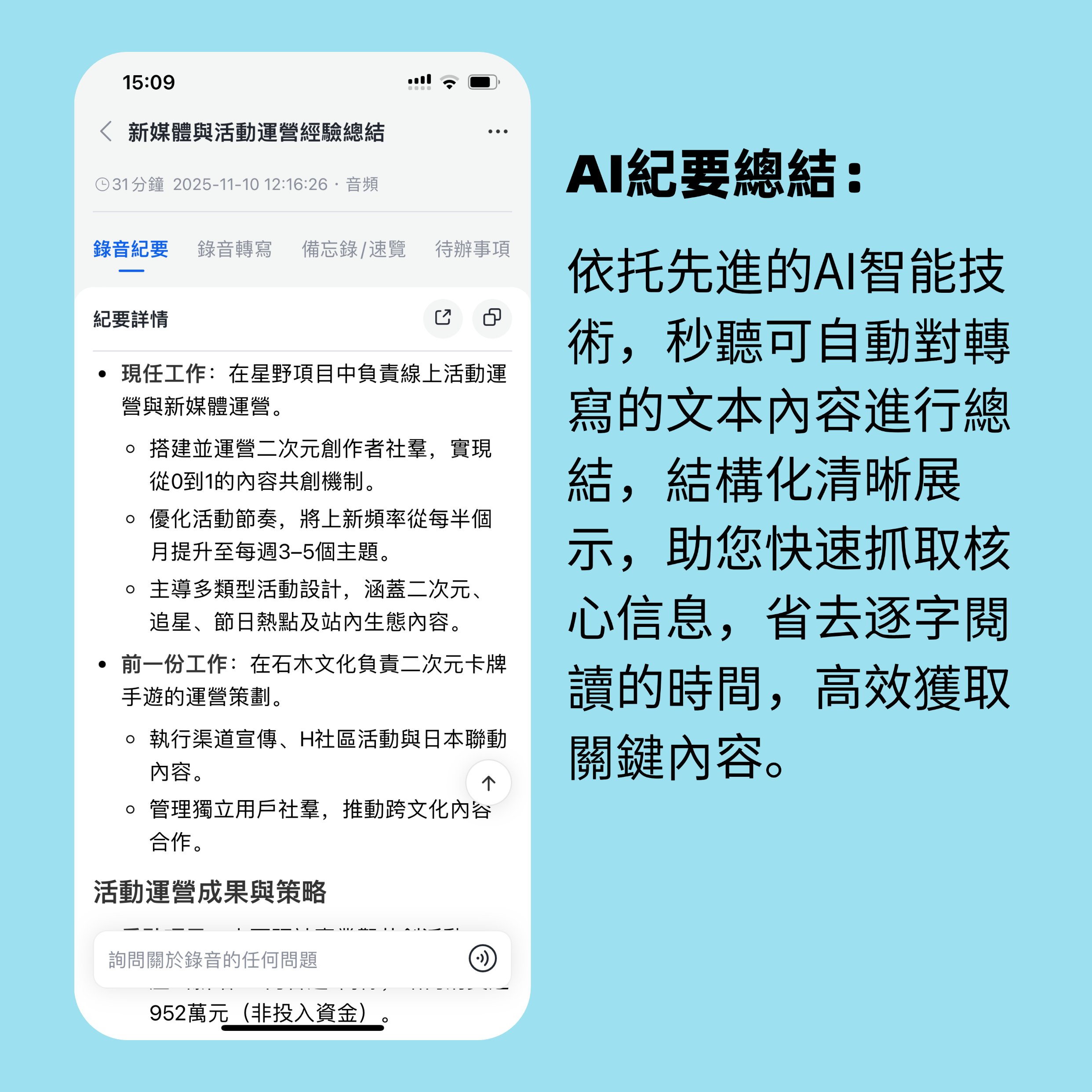 告別錯過的細節、不明確的行動項目以及耗費數小時撰寫後續報告的煩惱。秒聽錄音助手讓回顧變得輕鬆。這個智慧 AI 會議助手能夠像隊友一樣積極參與會議,即時捕捉對話,並利用其強大的語音轉文字和 AI 摘要功能,自動生成會議重點和待辦事項清單。您可以免除手動筆記,輕鬆分配行動項目,追蹤進度,並即時分享會議摘要,確保清晰度和協作。