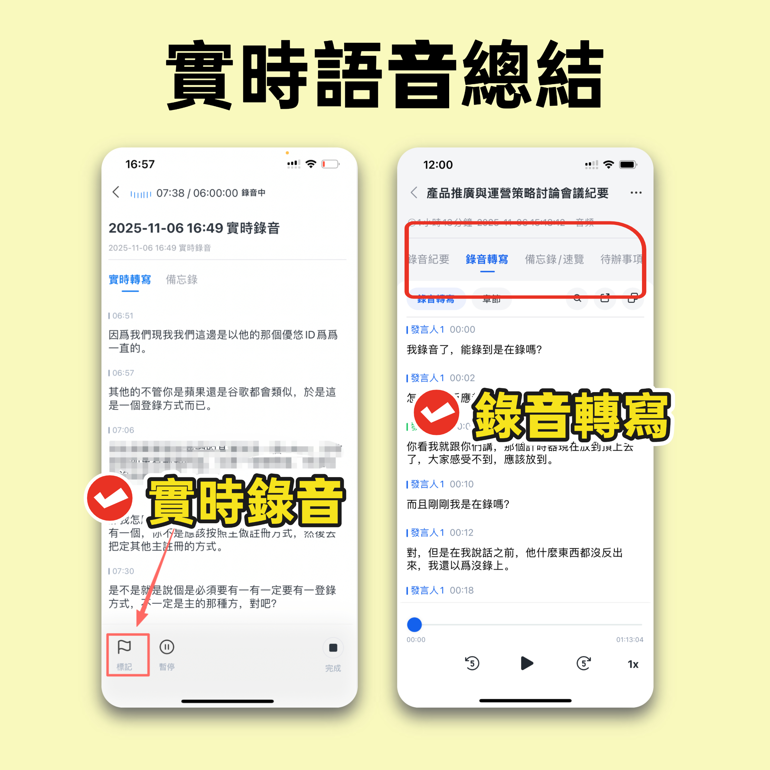 使用秒聽錄音在您的會議中做筆記,或將您的影音檔案上傳到秒聽錄音,它將自動轉錄每個字詞,生成AI總結,並標記關鍵待辦事項。秒聽錄音支援多種語言,包括中文、英文、日文、粵語和閩南語,讓您能輕鬆處理不同語言的內容。