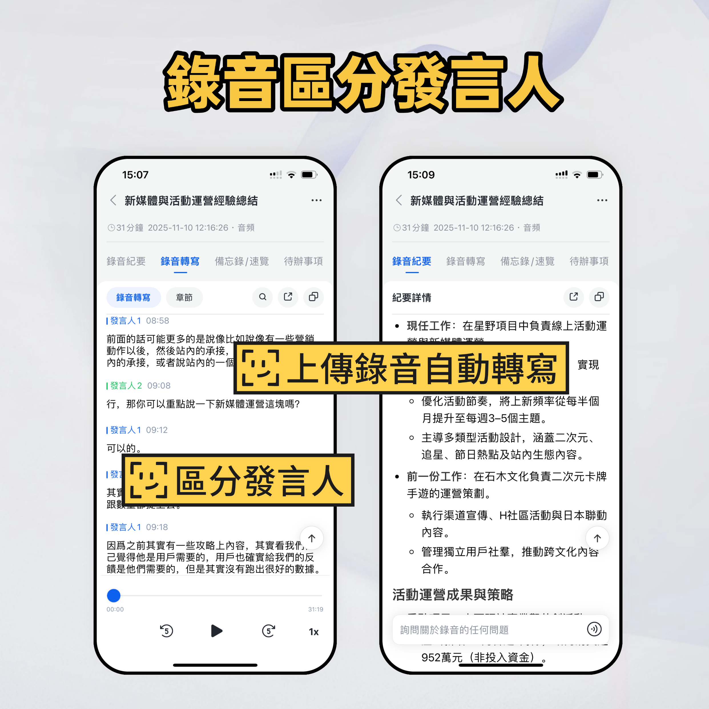 這些工具特別適合轉錄冗長或複雜的會議,讓你的手指得以休息,專注於更重要的任務。秒聽錄音支援多國語言,包含中文、英文、日文、粵語與台語,滿足多元使用需求。