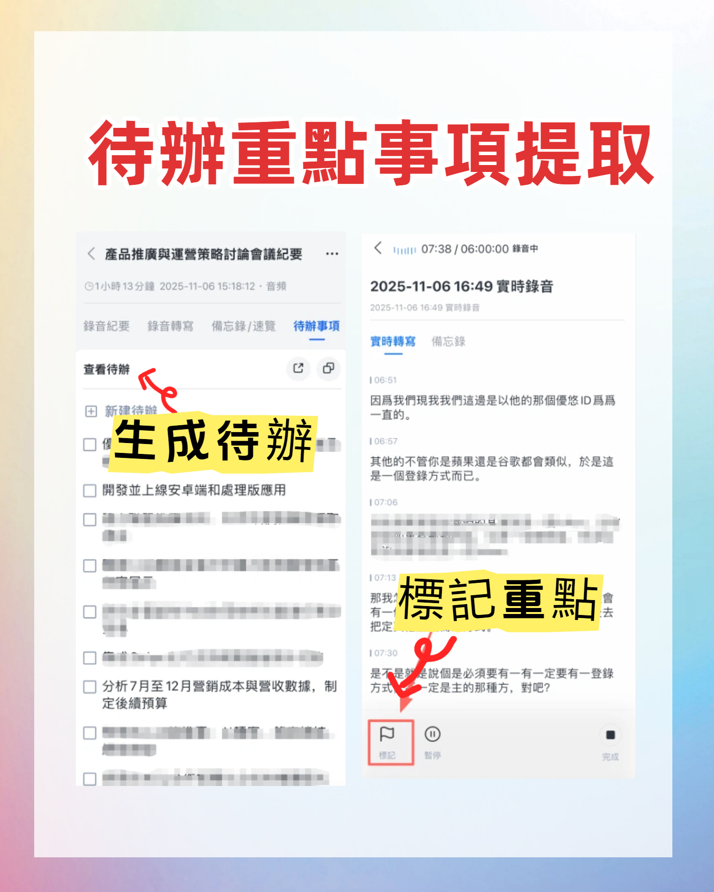 秒聽錄音支援即時錄音、多語系語音轉文字(包含中文、英文、日文、粵語、台語),並自動生成會議逐字稿與摘要,包含議程要點與行動項目清單。這些智能會議記錄正是提升效率、加速專案推動的關鍵。