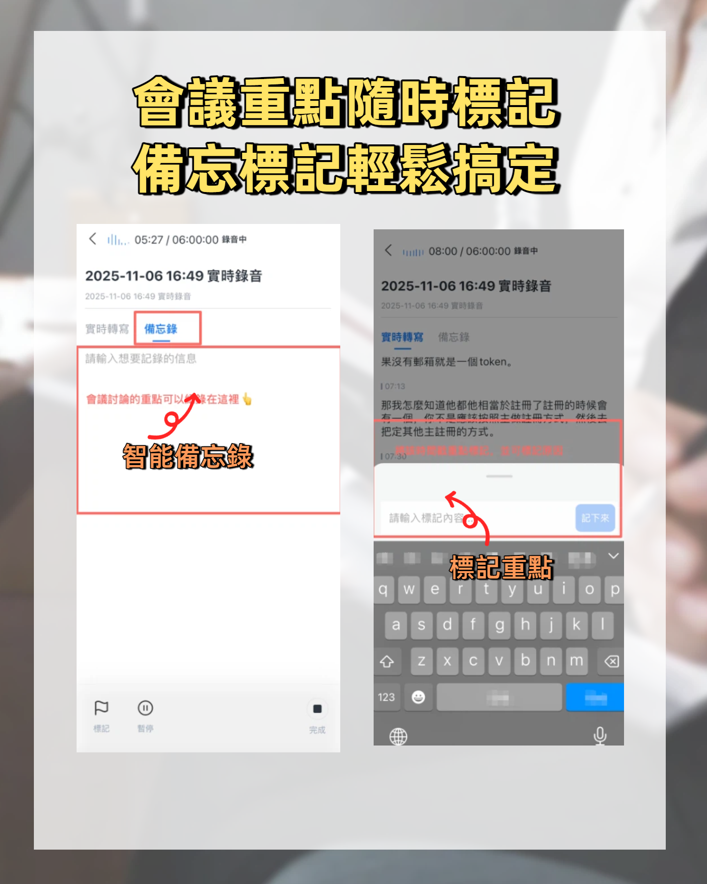 在對話中同時手動記錄文字,往往導致錯過重點、分心脫節。事後重聽錄音雖看似可行,卻耗時費力。這正是語音轉文字應用的價值所在。