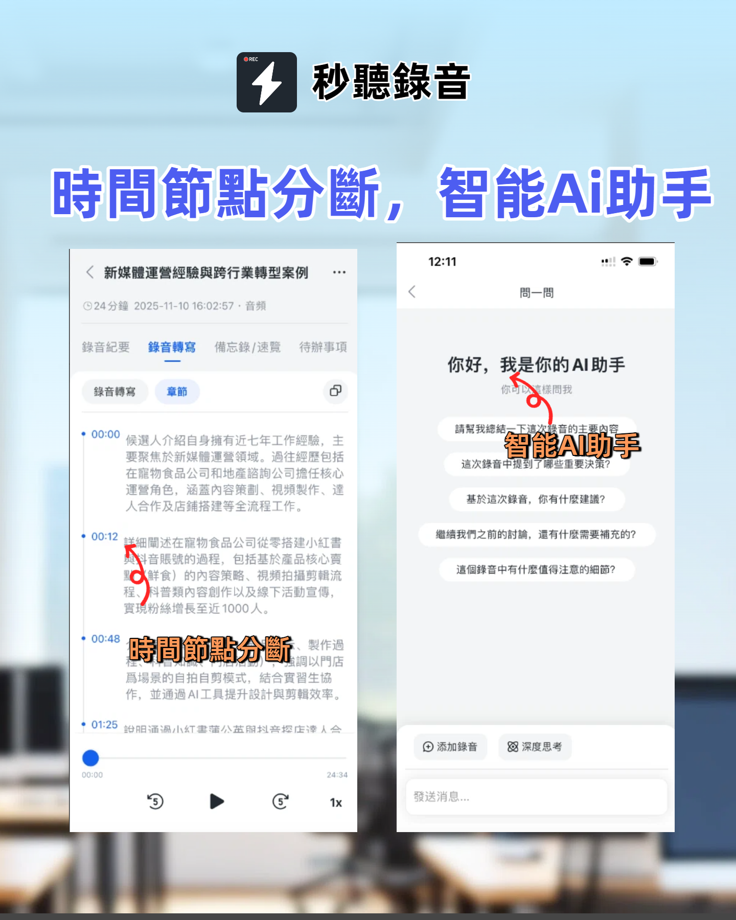 - 要:使用秒聽錄音提升跟進品質——秒聽錄音助手能自動提取會議中的重點、待辦事項甚至情緒氛圍,幫助你生成精準的跟進內容。支援中文、英文、日文、粵語、閩南語等多語言即時轉錄與AI摘要,讓你的郵件更具說服力。