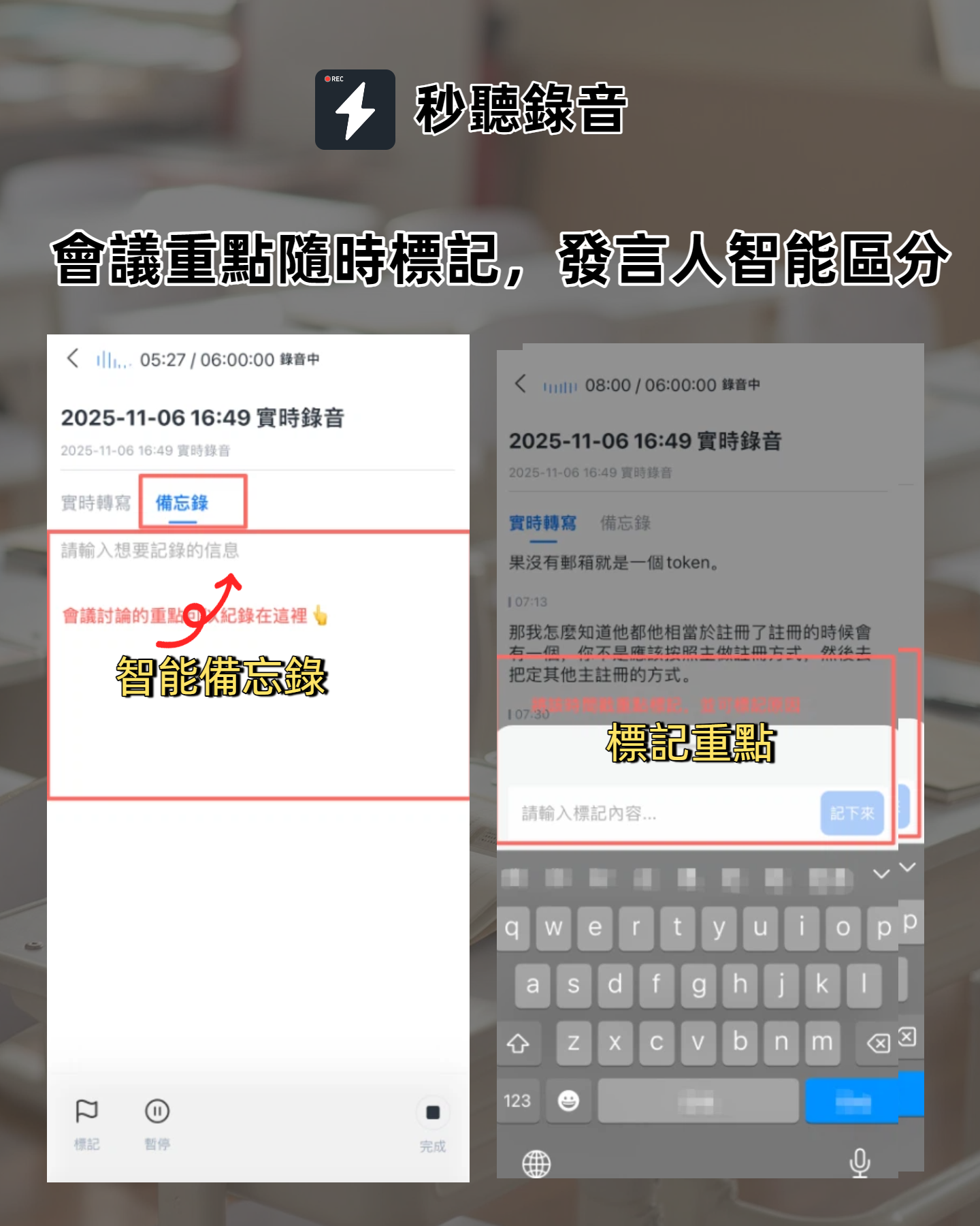 - 使用秒聽錄音助手:讓「秒聽錄音助手」即時幫你記錄重點與生成摘要,專注於討論內容,重要資訊自動保存。
